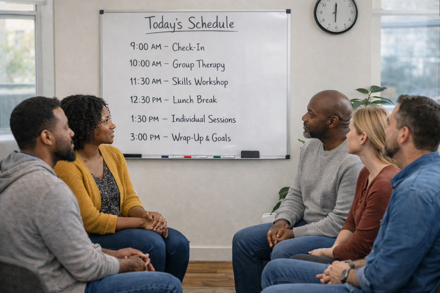 The day is organized around a combination of therapeutic activities that may include group therapy sessions, skills-based discussions, and educational components. Sessions are scheduled with appropriate breaks to support focus, reduce fatigue, and allow time for reflection. The structure of the day is designed to be predictable while still flexible enough to respond to individual needs.